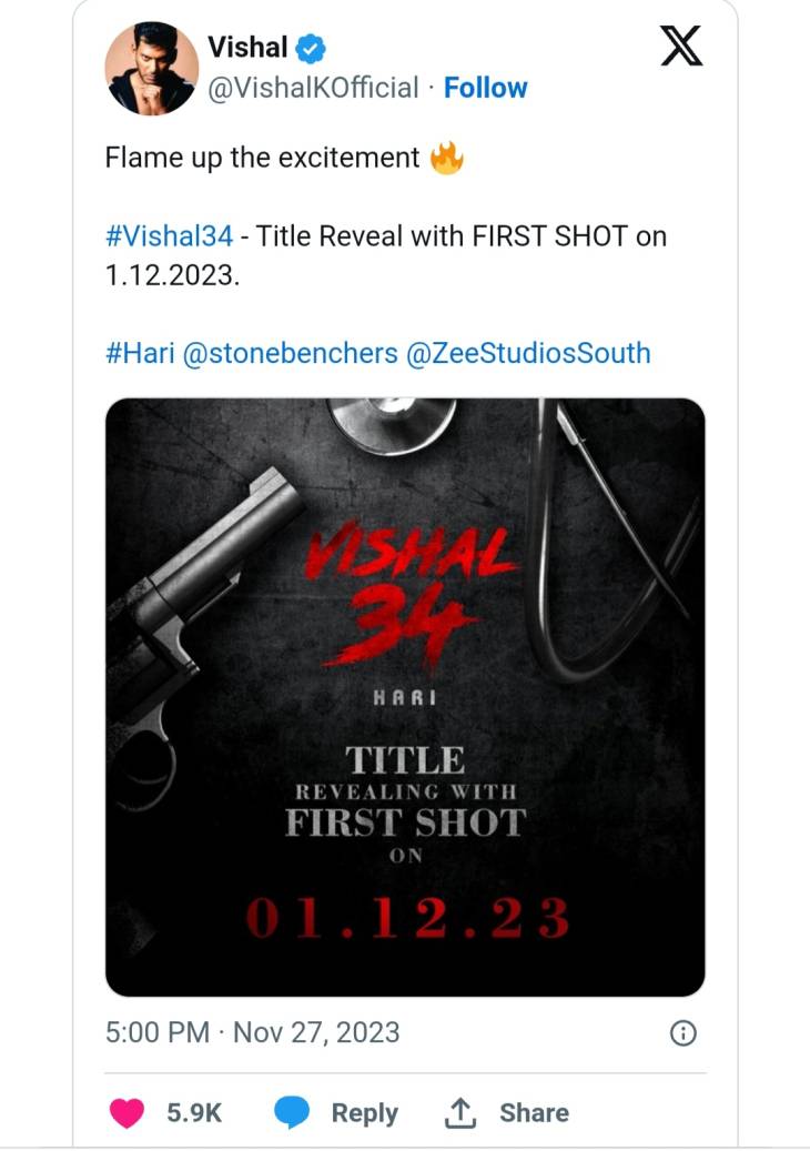 இந்நிலையில் விஷால் 34 படத்தின் முக்கிய அறிவிப்பை நடிகர் விஷால் நேற்று தனது எக்ஸ் வலைதள பக்கத்தில் வெளியிட்டார். அவர் அந்த பதிவில், விஷால் 34 படத்தின் டைட்டில் உடன் பர்ஸ்ட் லுக் போஸ்டர் வருகின்ற டிசம்பர் 1 ஆம் தேதி வெளியிடப்படும் என்று தெரிவித்துள்ளார். தாமிரபரணி, பூஜை திரைப்படங்களுக்கு பிறகு விஷால் - ஹரி வெற்றி கூட்டணி மீண்டும் இணைந்து உள்ளதால் ரசிகர்கள் மகிழ்ச்சி அடைந்துள்ளனர்.