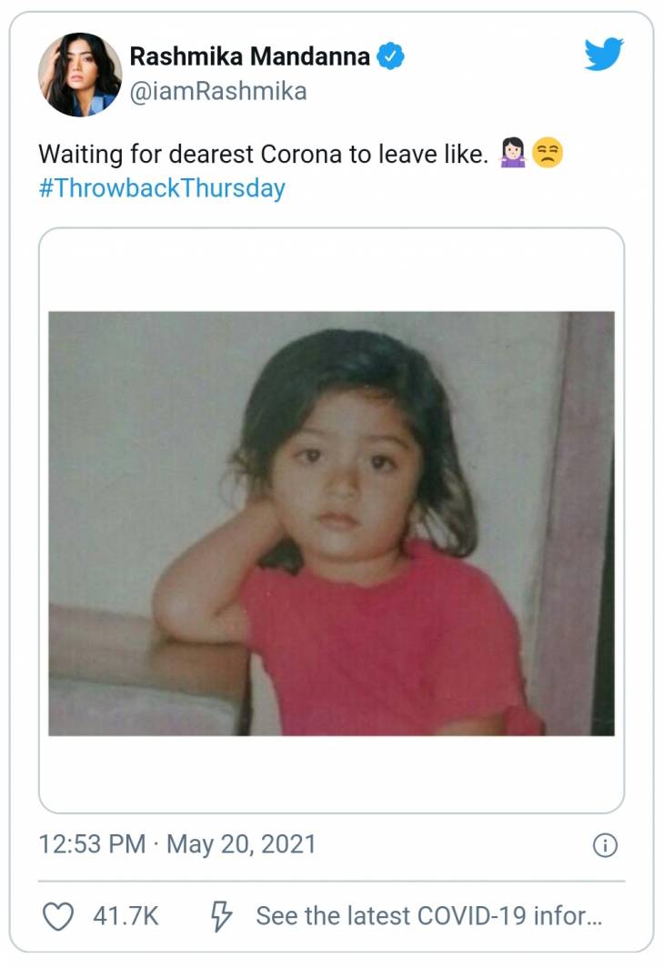 இந்நிலையில் ஊடரங்கு காரணமாக படப்பிடிப்புகள் இல்லாததால் வீட்டியே முடங்கி கிடக்கிறார் ராஷ்மிகா. இதனால் சமூக வலைத்தளத்தில் ஆக்டிவாக இருக்கும் அவர், தனது குழந்தை பருவ புகைப்படம் ஒன்றை பதிவிட்டுள்ளார். இதோடு, ‘கொரானா எப்போது நம்மை விட்டுப் போகும் என காத்திருக்கிறேன்’ என்று கவலையுடன் கேள்வி ஒன்றை எழுப்பியுள்ளார். ராஷ்மிகாவின் இந்த அழகான புகைப்படம் தற்போது சமூக வலைத்தளத்தில் வேகமாக பரவி வருகிறது.