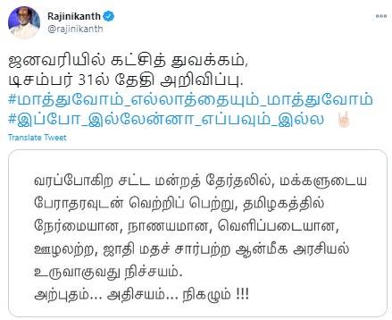 ரஜினிகாந்த் வெளியிட்டுள்ள ட்வீட் பதிவில், வரப்போகிற சட்ட மன்றத் தேர்தலில், மக்களுடைய பேராதரவுடன் வெற்றிப் பெற்று, தமிழகத்தில் நேர்மையான, நாணயமான, வெளிப்படையான, ஊழலற்ற, ஜாதி மதச் சார்பற்ற ஆன்மீக அரசியல் உருவாகுவது நிச்சயம். அற்புதம்.. அதிசயம் .. நிகழும்!" என்று கூறியுள்ளார்.
