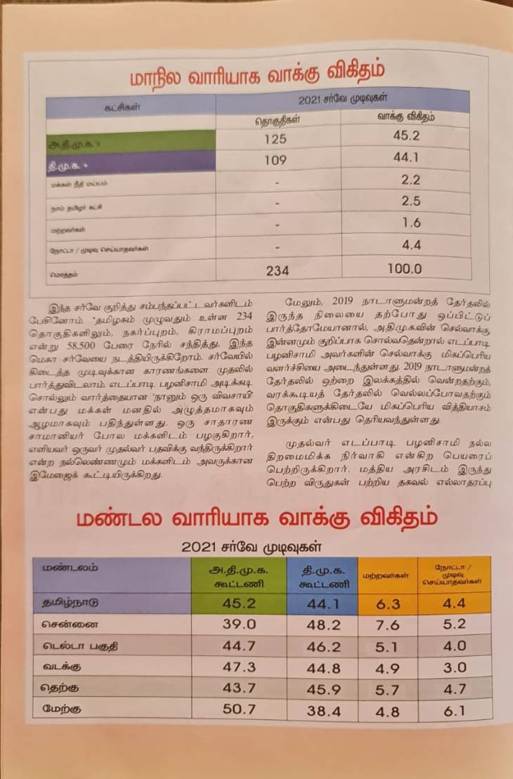 அதிமுக கூட்டணிக்கு 45.2 சதவீத வாக்குகளும், திமுக கூட்டணிக்கு 44.1 சதவீத வாக்குகளும் கிடைக்கும் என கூறியுள்ளது. இந்த சர்வே முடிவுகளால் அதிமுக சுறுசுறுப்பு அடைந்துள்ளது. அது மட்டுமின்றி கூட்டுறவு வங்கிகளில் விவசாயக்கடன் தள்ளுபடி செய்தது கூடுதல் பலம் எனவும் பார்க்கப்படுகிறது.