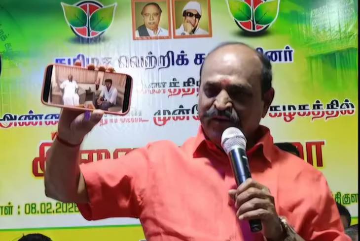 தன்னுடைய செல்போனில், விஜய் மற்றும் எடப்பாடி பழனிசாமி ஒன்றாக இருக்கும் அந்தப் பழைய புகைப்படத்தைக் காட்டித் தொண்டர்களிடையே உற்சாகத்தை ஏற்படுத்தினார்.