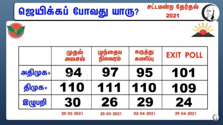 தேர்தலுக்கான பிந்தைய கருத்துக் கணிப்பிலும் ரங்கராஜ் பாண்டே அதே கருத்தை தான் முன்வைத்துள்ளார். 26 ஆக இருந்த இழுபறி எண்ணிக்கை 24 ஆக குறைந்தது மட்டுமே மாற்றம். தற்போதைய நிலவரத்தின் படி, 101 இடங்களில் அதிமுக கூட்டணியும் 109 இடங்களில் திமுக கூட்டணியும் வெற்றி பெறும் என்று கூறுகிறார். எஞ்சியிருக்கும் 24 தொகுதிகள் தான் யாருக்கு வெற்றி மகுடம் என்பதை நிர்ணயிக்கும் என்றும் அவர் சொல்கிறார்.