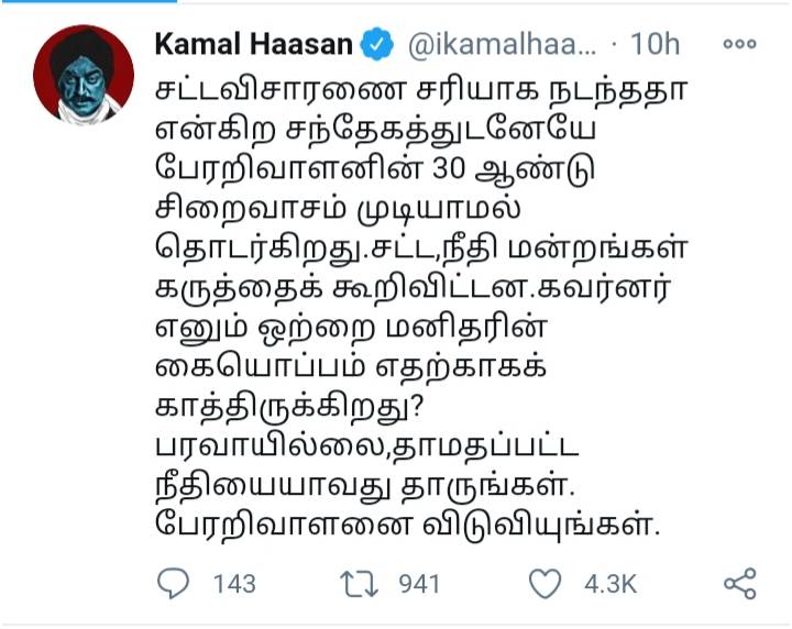 ராஜீவ் காந்தி கொலை வழக்கில் தாமதப்பட்ட நீதியையாவது தாங்கள். பேரறிவாளனை விடுவியுங்கள் என்று மக்கள் நீதி மய்யத்தின் தலைவர் கமல்ஹாசன் வலியுறுத்தி உள்ளார்.