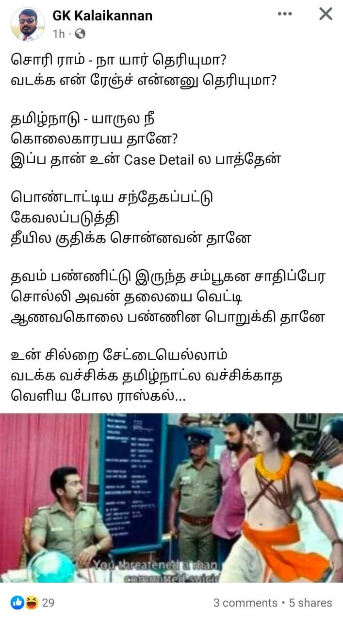 அந்த மனுவில் நெல்லை மாவட்டம் ஆதி தமிழர் பேரவையை சேர்ந்த மாவட்டச் செயலாளர் கலைக் கண்ணன் என்பவர் தனது முகநூல் பக்கத்தில் ராமபிரானை இழிவுபடுத்தும் விதமாக கருத்துக்களை வெளியிட்டுள்ளார். நீ கொலைகார பயல் தானே இப்பதான் உன் கேஸ் டீடைல் பார்த்தேன் பொண்டாட்டியை சந்தேகப்பட்டு கேவலப்படுத்தி தீக்குளிக்க செஞ்சவன் தானே, தவம் பண்ணிக்கிட்டு இருந்த சம்பூகன சாதி பெயரை சொல்லி அவன் தலையை வெட்டி ஆவணகொலை பண்ணின பொறுக்கி தானே, வாலியை கேவலமாக மறைந்து கொன்றவன் தானே, உன் சில்லறை சேட்டை எல்லாம் வடக்க வச்சுக்கோ தமிழ்நாட்டில் வச்சிகாதே என்பது போன்ற வசனத்தை சூர்யா பேசுவது போலவும், ராமபிரான் நின்று குற்றவாளி போல் கேட்பது போலவும், சூர்யா நடித்த சிங்கம் படத்தை வெளியிட்டு ஒரு கலவரத்தை தூண்டும் விதமாக வெளியிட்டுள்ளார். அவரை உடனடியாக கைது செய்ய வேண்டும் என்று அந்த மனுவில் அவர் தெரிவித்து இருந்தார். இந்த சம்பவம் நெல்லையில் பரபரப்பு ஏற்படுத்தி உள்ளது.