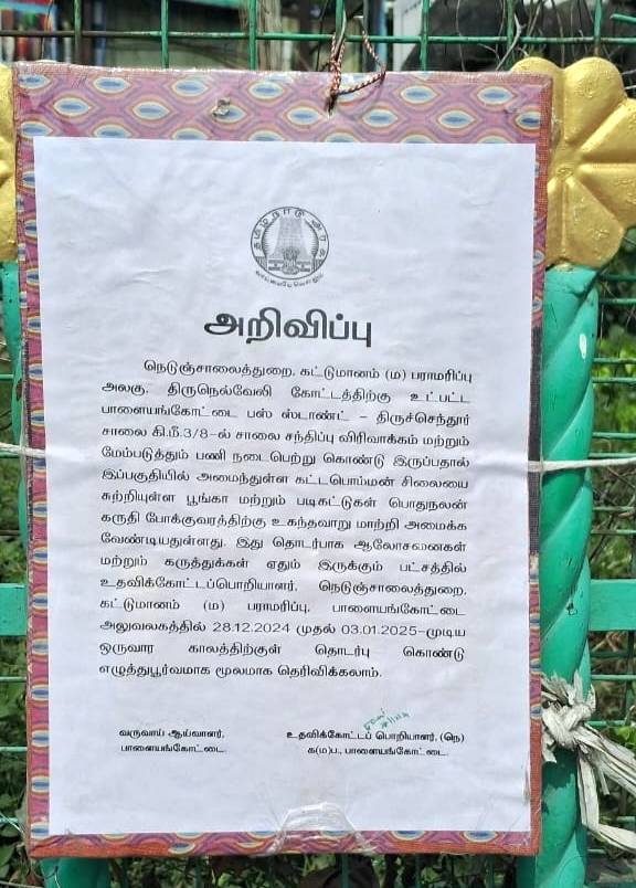 சாலை விரிவாக்கத்துக்காக, பாளையங்கோட்டை வீரபாண்டிய கட்டபொம்மன் சிலை அருகேயுள்ள பூங்கா மற்றும் படிகட்டை மாற்றியமைக்க நடவடிக்கை எடுக்கப்பட்டுள்ளது.