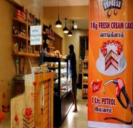 ஒரு கிலோ கேக் வாங்கும் வாடிக்கையாளர்களுக்கு ஒரு லிட்டர் பெட்ரோல் இலவசமாக திருச்சி பேக்கரி கடை ஒன்றில் வழங்கப்படுகிறது