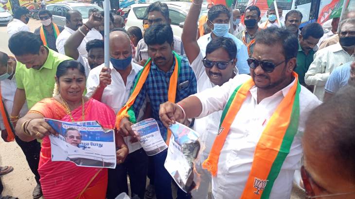 இந்நிலையில் சார்ஜ் பொன்னையா அவதூறு பேச்சை கண்டித்தும் அவர் மீது கடுமையான நடவடிக்கை எடுக்க வலியுறுத்தியும் தூத்துக்குடி தெற்கு மாவட்ட பாஜக சார்பில், தூத்துக்குடி சிதம்பர நகர் பேருந்து நிறுத்தம் அருகில் கண்டன ஆர்ப்பாட்டம் நடைபெற்றது. அப்போது ஜார்ஜ் பொன்னையாவின் புகைப்படம் தீயிட்டு கொளுத்தப்பட்டது.