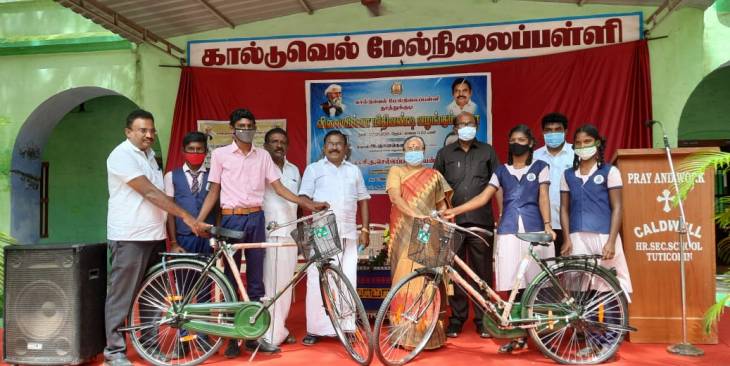 கால்டுவெல் மேல்நிலைப்பள்ளியில் மாணவர்களுக்கான விலையில்லா மிதிவண்டியை சி.த செல்லப்பாண்டியன் வழங்கினார்.