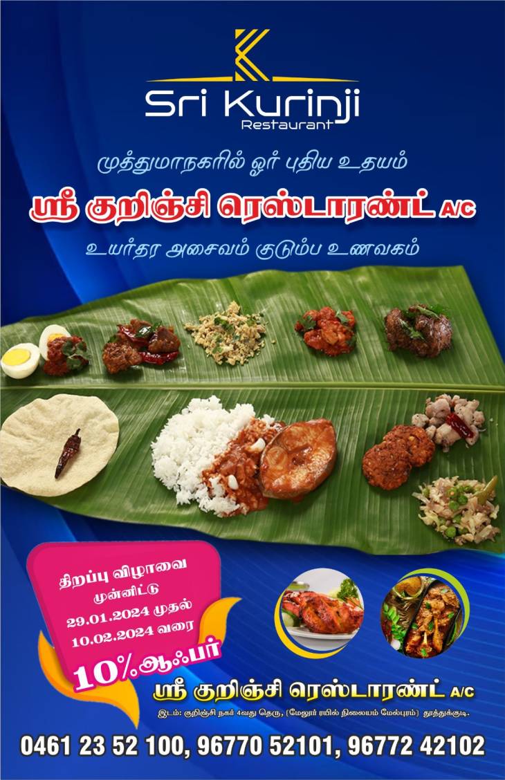 இந்த உணவகமானது தூத்துக்குடி 4 வது ரயில்வே கேட் அருகே, மீளவிட்டான் செல்லும் சாலையில், 160F/4B, குறிஞ்சி நகர் 4வது தெரு, (மேலுார் ரயில் நிலையம் மேல்பக்கம்), போல்நாயக்கன்பேட்டை பகுதியில் நாளை 28.01.2024 ஞாயிற்றுக்கிழமை அன்று காலை 10.30 மணிக்கு திறப்பு காண்கிறது.