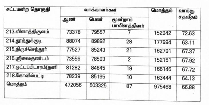 இது தொடர்பாக ஆட்சியர் வெளியிட்ட செய்திக்குறிப்பில், "தூத்துக்குடி பாராளுமன்ற தொகுதிக்கு 19.04.2024 அன்று காலை 7 மணிக்கு தொடங்கி மாலை 6 மணி வரை 1624 வாக்குச்சாவடிகளில் வாக்குப்பதிவு நடைபெற்றது. தூத்துக்குடி பாராளுமன்ற தொகுதியில் வாக்குப்பதிவு மிகவும் சுமூகமாகவும் அமைதியான முறையிலும் எந்தவொரு அசம்பாவிதமும் நிகழாமல் நடைபெற்றது. இத்தொகுதியில் 472056 ஆண் வாக்காளர்களும் 503325 பெண் வாக்காளர்களும் மற்றும் 87 மூன்றாம் பாலினத்தினர் என மொத்தம் 975468 (66.88%) வாக்காளர்கள் தங்களது வாக்குகளை பதிவு செய்துள்ளனர்.