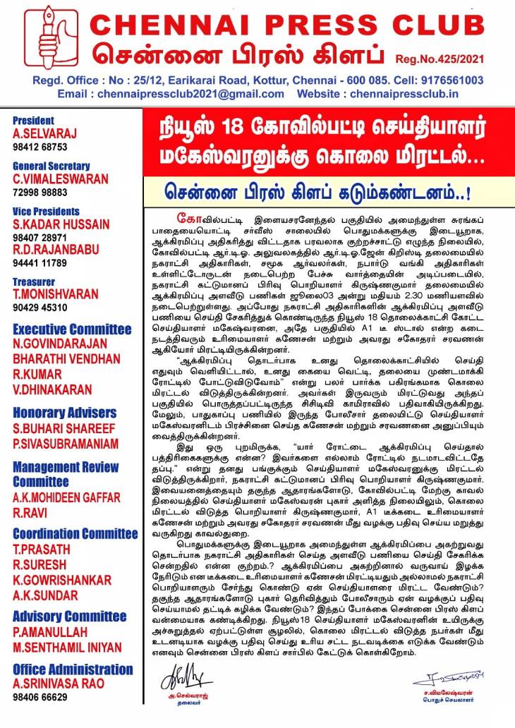 இது தொடர்பாக சென்னை பிரஸ் கிளப் வெளியிட்டுள்ள கண்டன அறிக்கையில் கூறப்பட்டுள்ளதாவது ;-