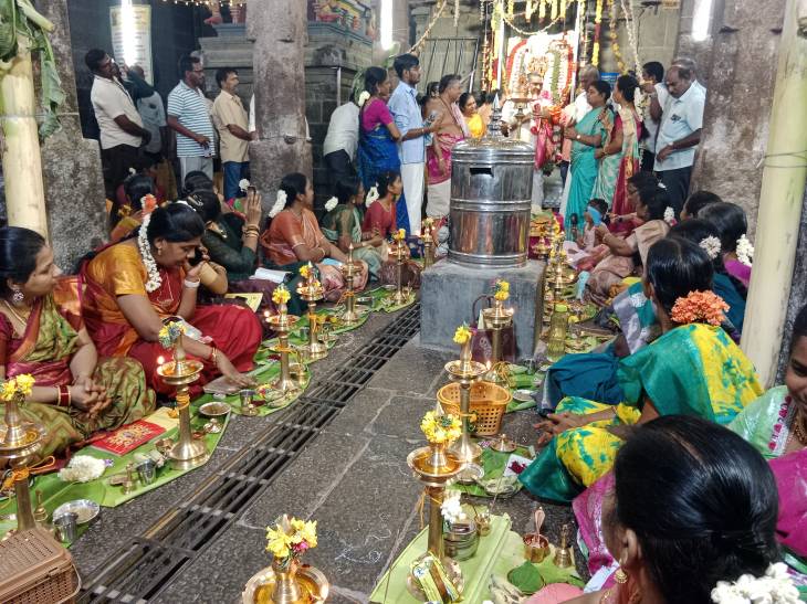 இன்று மாலை திருவிளக்கு பூஜை நடைபெறுவதை தொடர்ந்து சமூக நலன் மற்றும் மகளிர் உரிமை துறை அமைச்சரும், வடக்கு மாவட்ட திமுக செயலாளருமான கீதா ஜீவன் சிறப்பு அழைப்பாளராக கலந்து கொண்டு திருவிளக்கு பூஜையை தொடங்கி வைத்தார்.