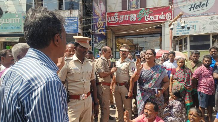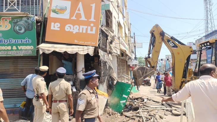 இதையடுத்து, அப்பகுதியில் உள்ள முகப்பு கடைகள் மற்றும் ஆக்கிரமிப்புகளை அகற்ற சுமார் 200க்கும் மேற்பட்ட போலீஸ் பாதுகாப்புடன் அதிகாரிகள் சென்றனர். கடைகளை இடிப்பதற்கு அப்பகுதியுள்ள கடையினர் எதிர்ப்பு தெரிவித்தனர். கடைகள், ஆக்கிரமிப்புகளை முழுமையாக அகற்ற வலியுறுத்தி ஐந்தாவது தூண் அமைப்பின் தலைவர் சங்கரலிங்கம் , நகர் மன்ற உறுப்பினர் மணிமாலா ஆகியோர் தலைமையில் அப்பகுதி பொதுமக்கள் மெயின் ரோட்டில் சாலையில் அமர்ந்து மறியல் போராட்டத்தில் ஈடுபட்டனர். இதனைத் தொடர்ந்து கடைகளை இடிக்கும் பணி தொடங்கியது.