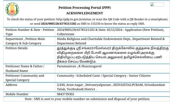 உயர்த்தி தூத்துக்குடி மாவட்ட ஆட்சியர் மற்றும் இந்து சமய அறநிலையத்துறையின் உயரதிகாரிகள் மேற்கண்ட இந்து சமய அறநிலையத் துறையின் தூத்துக்குடி அருள்மிகு ஶ்ரீ சங்கரராமேஸ்வரர் திருக்கோவில் நிர்வாக செயல் அலுவலர் வீ.தமிழ்ச்செல்வி மீது துறைரீதியான விசாரணை மேற்கொள்ளப்பட்டு பணிநீக்கம் செய்திட வேண்டுமாறு பணிவன்புடன் கேட்டுக்கொள்கிறேன். இவ்வாறு மனுவில் கூறப்பட்டுள்ளது.