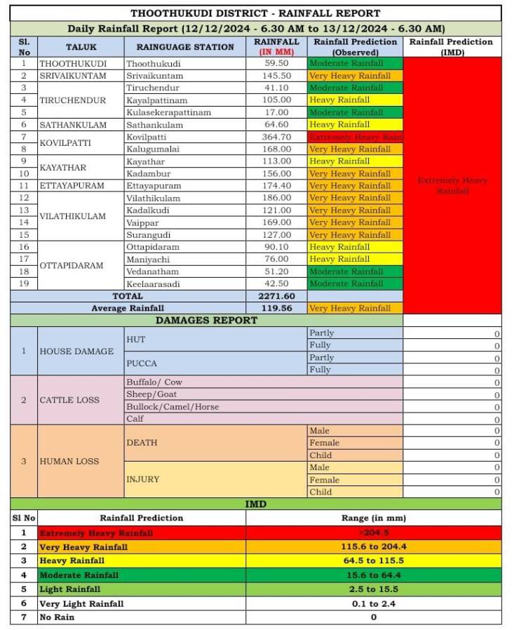இந்தநிலையில், தூத்துக்குடி மாவட்டத்தில் 12.12.24 காலை 6.30 மணி முதல் 13.12.24 காலை 6.30 மணி வரை கடந்த 24 மணி வரை பெய்த மழை பொழிவு குறித்த அளவு விபரத்தை மாவட்ட நிர்வாகம் வெளியிட்டுள்ளது. அதன்படி,