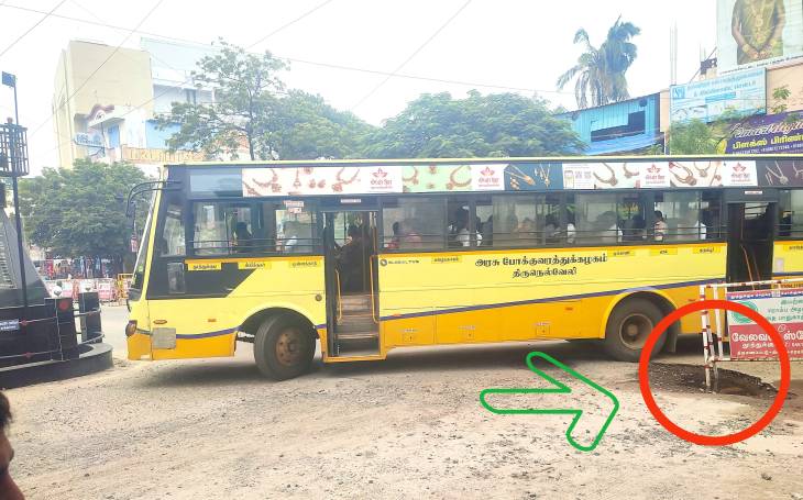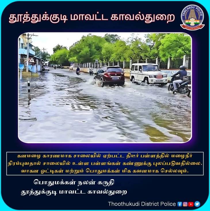 இந்நிலையில், கனமழை காரணமாக சாலையில் ஏற்பட்ட திடீர் பள்ளத்தில் மழைநீர் நிரம்புவதால் சாலையில் உள்ள பள்ளங்கள் கண்ணுக்கு புலப்படுவதில்லை. வாகன ஓட்டிகள் மற்றும் பொதுமக்கள் மிக கவனமாக செல்லவும் என தூத்துக்குடி மாவட்ட காவல்துறை சார்பிலும் பொதுமக்களுக்கு அறிவுறுத்தியுள்ளது.