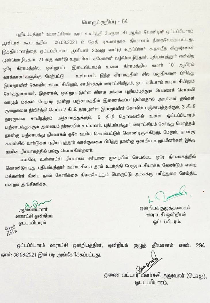 புதியம்புத்தூர் ஊராட்சியை தரம் உயர்த்தி பேரூராட்சி ஆக்க வேண்டி ஓட்டப்பிடாரம் யூனியன் கூட்டத்தில் 06.08.2021 ம் தேதி ஏகமனதாக தீர்மானம் நிறைவேற்றப்பட்டது.