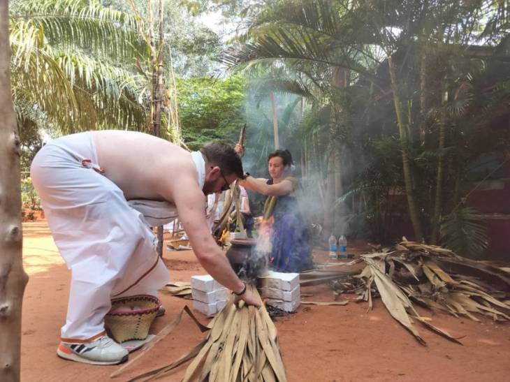 இதற்காக, தோட்டம் முழுவதும் கரும்பு, மஞ்சள் குலை, வாழை தோரணங்கள் கட்டப்பட்டிருந்தன. ஆட்டோக்களில் தோட்டத்துக்கு வந்த அவர்களுக்கு மாலை அணிவித்து வரவேற்பு அளிக்கப்பட்டது. பின், அனைவரும் தமிழர்களின் பாரம்பரிய உடையான வேட்டி, சேலை அணிந்தனர்.