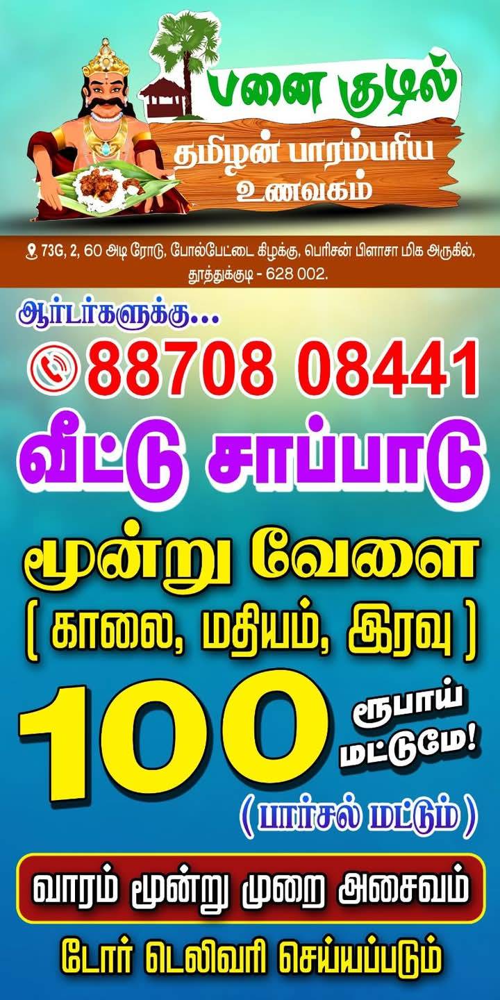 இவ்வாறு, வேலைக்காகவும், படிப்புகளுக்காவும் தூத்துக்குடியில் தங்கியிருப்பவர்களுக்கான மிக முக்கியமான பிரச்சனையும், எதிர்பார்ப்பும் என்னவென்றால், குறைந்த செலவில், நிறைவான உணவு தூத்துக்குடியில் எங்கு கிடைக்கும் என்ற தேடல் தான். அப்படி அவர்களின் தேடல்களையும், தேவைகளையும் புரிந்து கொண்டு, அதனை பூர்த்தி செய்யும் விதமாக தூத்துக்குடியில் உள்ள ஒரு உணவகம் ஒரு அசத்தலான உணவு சலுகையை தந்துள்ளது. தூத்துக்குடி 60 அடி ரோடு போல்பேட்டை கிழக்கு, பெரிசன் பிளாசா மிக அருகில் அமைந்துள்ள பனை குடில் தமிழ் பாரம்பரிய வீட்டு சாப்பாடு உணவகம் தான் இந்த சலுகை விலை உணவு புரட்சியை தூத்துக்குடியில் செய்துள்ளது.