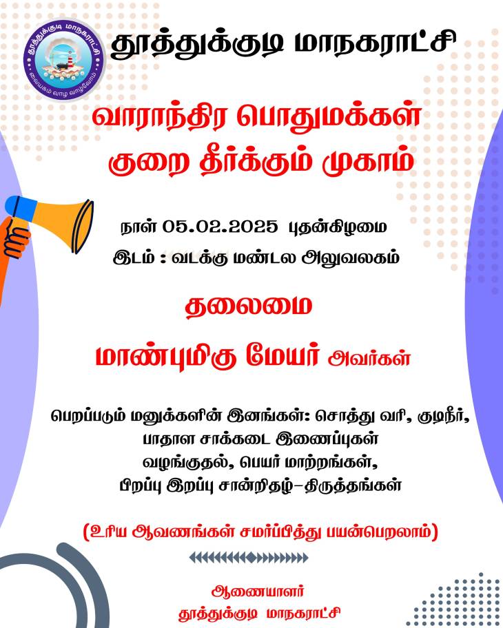 இதன் தொடர்ச்சியாக வடக்கு மண்டல அலுவலகத்தில் வைத்து பொதுமக்கள் குறைதீர்க்கும் மண்டல முகாமானது புதன்கிழமை (05.2.25) அன்று காலை 10.00 மணிக்கு வடக்கு மண்டலத்திற்குட்பட்ட (வார்டு எண்கள் 01முதல் 14 மற்றும் 20) ஆகிய பகுதிகளில் வசிக்கும் பொதுமக்களிடம் இருந்து கோரிக்கை மனுக்கள் பெறப்பட உள்ளது.