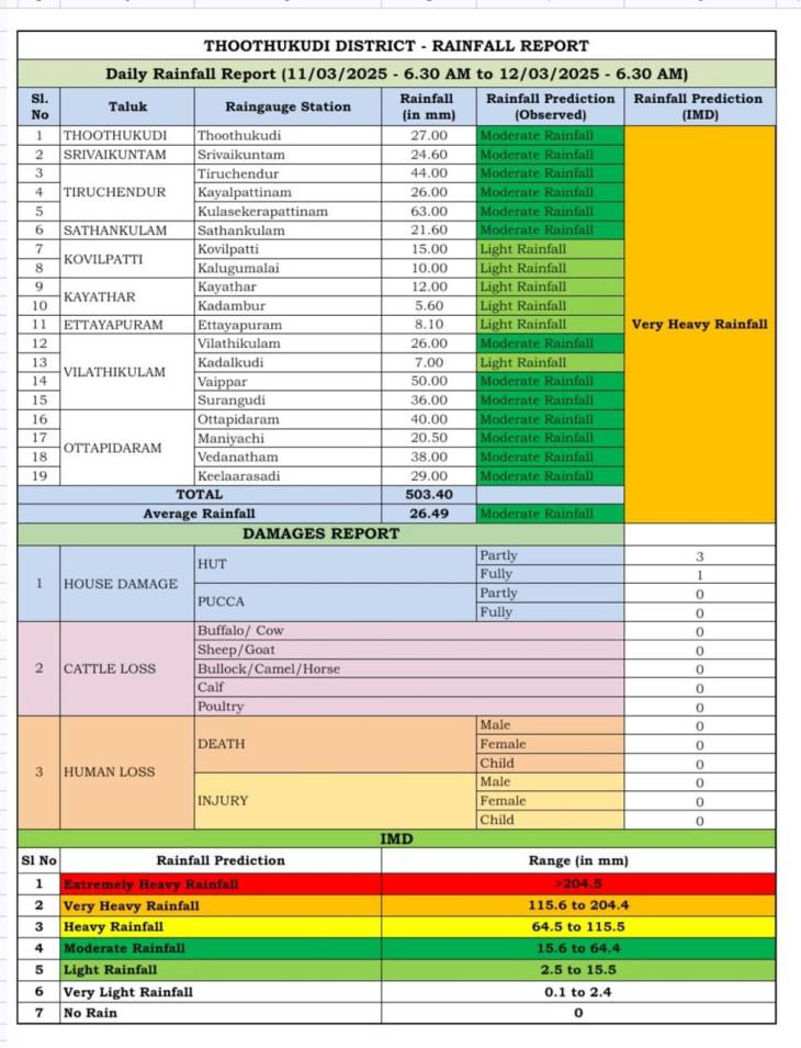 தூத்துக்குடி மாவட்டத்தில் நேற்று ( 11.03.25 ) காலை 6.30 மணி முத இன்று( 12.03.2025) காலை 6.30 மணி வரை பெய்த மழை விவரங்கள் பின்வருமாறு:-