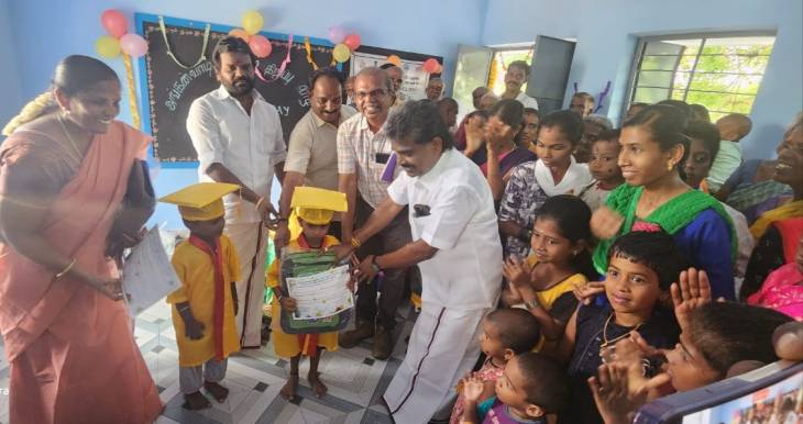 தொடர்ந்து, அங்கன்வாடி மையத்தில் பயின்று முதலாம் வகுப்பு செல்லும் குழந்தைகளுக்கு சான்றிதழ் மற்றும் புத்தக பை வழங்கி பாராட்டினார்.