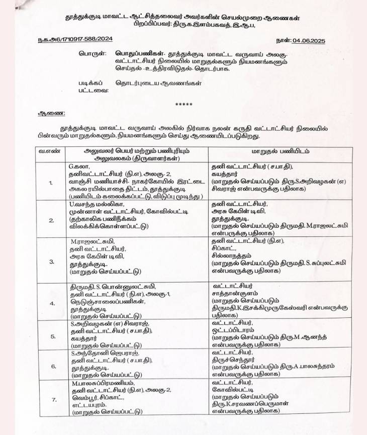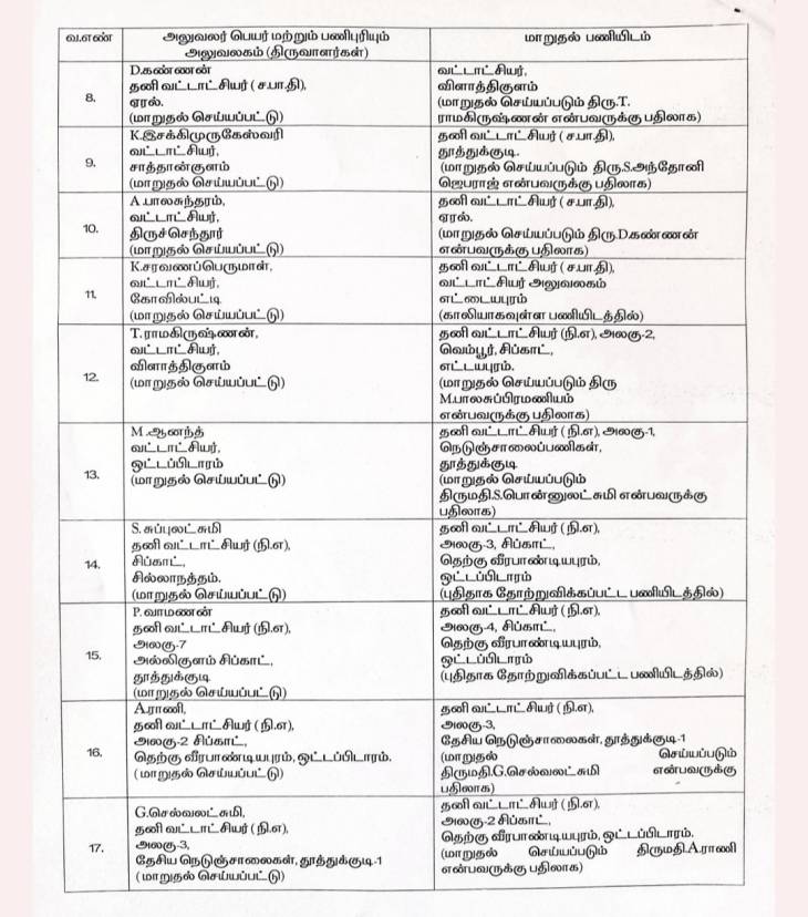 தூத்துக்குடி மாவட்ட வருவாய் அலகில் நிர்வாக நலன் கருதி வட்டாட்சியர் நிலையில் 17 பேரை மாறுதல்களும், நியமனங்களும் செய்து தூத்துக்குடி மாவட்ட ஆட்சித்தலைவர் இளம்பகவத் உத்தரவிட்டுள்ளார். அதன்படி