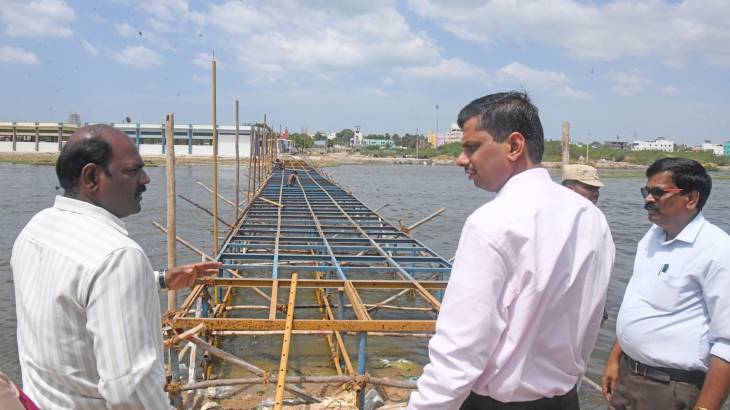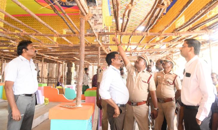 தொடர்ந்து, வேள்விச்சாலை அருகில் அமைக்கப்படவுள்ள மர கேலரி மற்றும் ராஜகோபுரம், விமானங்களில் அமைக்கப்படும் படிசாரங்களை (Watch Tower, T.V. Tower) ஆய்வு செய்து, அதுபோல், ஜே.ஜே நகர் பகுதியில் அமைக்கப்பட்டுள்ள வாகனங்கள் நிறுத்துமிடங்களிலிருந்து சுவாமி தரிசனம் செய்வதற்கு ஏதுவாக மிகைநீர் கால்வாயின் குறுக்கே இரும்பினால் ஆன தற்காலிக மரப்பாலம் அமைப்பட்டு வரும் நிலையில், தேவையான ஆலோசனைகள் வழங்கி மரப்பாலத்தின் உறுதித்தன்மை சான்று வழங்க பொதுப்பணித்துறையினரை கேட்டுக் கொண்டார்கள்.