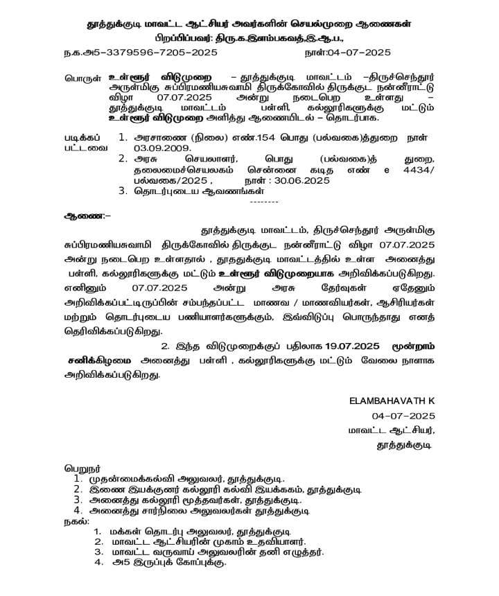 தூத்துக்குடி மாவட்டம், திருச்செந்தூர் அருள்மிகு சுப்பிரமணியசுவாமி திருக்கோவில் திருக்குடமுழுக்கு நன்னீராட்டு விழா 07.07.2025 அன்று திங்கட்கிழமை நடைபெற உள்ளதால். தூத்துக்குடி மாவட்டத்தில் உள்ள அனைத்து பள்ளி. கல்லூரிகளுக்கு மட்டும் உள்ளூர் விடுமுறையாக அறிவிக்கப்படுகிறது.