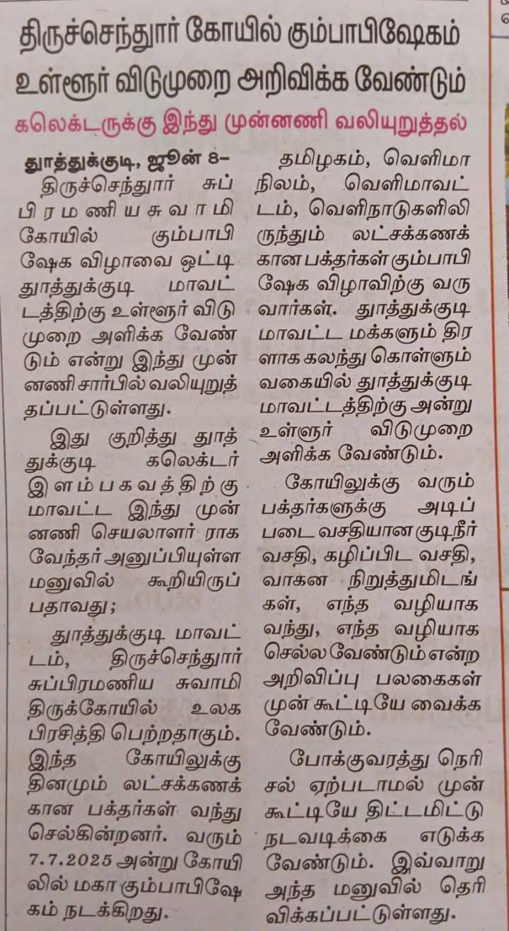 முன்னதாக, திருச்செந்தூர் அருள்மிகு சுப்பிரமணியசுவாமி திருக்கோவில் திருக்குடமுழுக்கு நன்னீராட்டு விழா 07.07.2025 அன்று தூத்துக்குடி மாவட்டத்திற்கு உள்ளூர் விடுமுறை அளிக்க வேண்டும் என தூத்துக்குடி இந்து முன்னணி மாவட்ட செயலாளர் ராகவேந்திரா உள்ளிட்டோர் தூத்துக்குடி மாவட்ட ஆட்சியருக்கு கோரிக்கை விடுத்திருந்தனர் என்பது குறிப்பிடதக்கது.