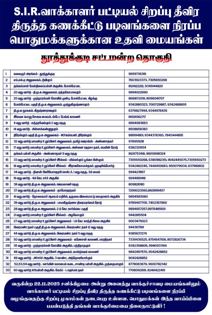 தூத்துக்குடி சட்டமன்ற தொகுதியில், S.I.R.வாக்காளர் பட்டியல் சிறப்பு தீவிர திருத்த கணக்கீட்டு படிவங்களை நிரப்ப பொதுமக்களுக்கான உதவி மையங்கள், வடக்கு மாவட்ட திமுக சார்பில் ஏற்படுத்தப்பட்டு, அவை எங்கெல்லாம் உள்ளது என்ற தகவல்கள் அறிவிக்கப்பட்டுள்ளது.