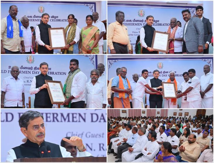ஆளுநர் மாளிகையில் நடைபெற்ற உலக மீனவர் தின கொண்டாட்டத்தில், சமூகத்துக்கும் தேசத்துக்கும் சிறப்பான பங்களிப்பை வழங்கிய 15 -க்கும் மேற்பட்ட மீனவ சமூக உறுப்பினர்களை ஆளுநர் ஆர்.என்.ரவி விருது வழங்கி சிறப்பித்தார்.