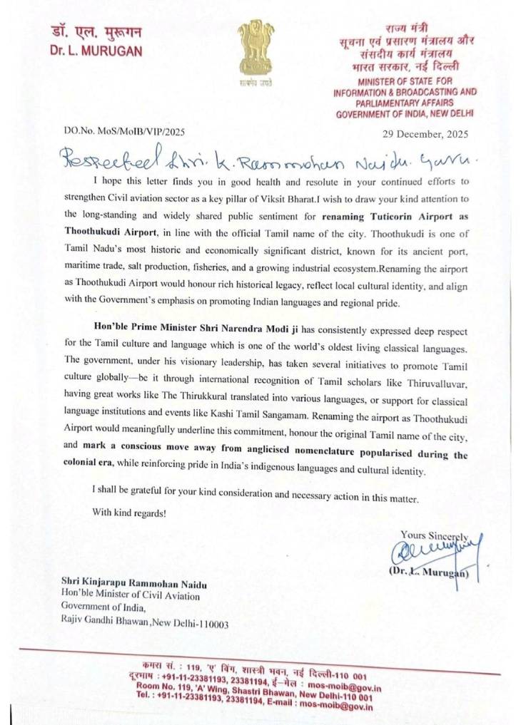 Tuticorin என்ற பெயரினை, தூத்துக்குடி விமான நிலையம் என்று மாற்ற விமானப் போக்குவரத்துத் துறை அமைச்சரிடம் எல்.முருகன் கோரிக்கை வைத்துள்ளார்.