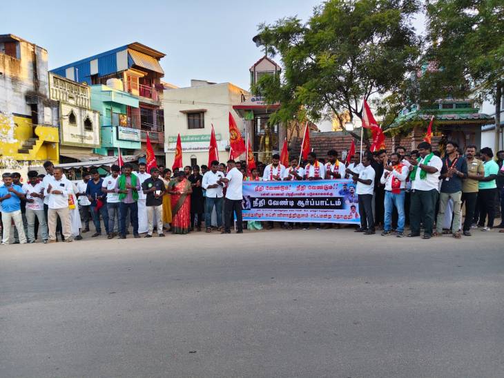 விளாத்திகுளம் அருகே வேடநத்தம் கிராம பள்ளி மாணவி படுகொலைக்கு நீதி வேண்டியும், 4 நாட்கள் கடந்தும் குற்றவாளிகள் கைது செய்ய படவில்லை எனவும், உடனடியாக கைது செய்ய வலியுறுத்தி நாம் தமிழர் கட்சி சார்பில் குளத்தூர் பஜார் பகுதியில் கண்டன ஆர்ப்பாட்டம் நடைபெற்றது. மேலும், அனைவரும் கையில் மெழுகுவர்த்தி ஏந்தி 5 நிமிடம் பள்ளி மாணவியின் இறப்பிற்கு அஞ்சலி செலுத்தப்பட்டது.